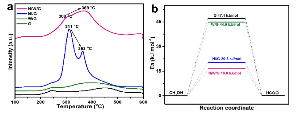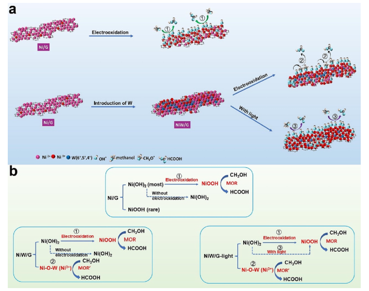 圖 9. (a) MOR 相對于 NiW/G 和 Ni/G 的擬議機(jī)制; (b) 為 MOR 準(zhǔn)備的樣品的擬議反應(yīng)位點(diǎn)。