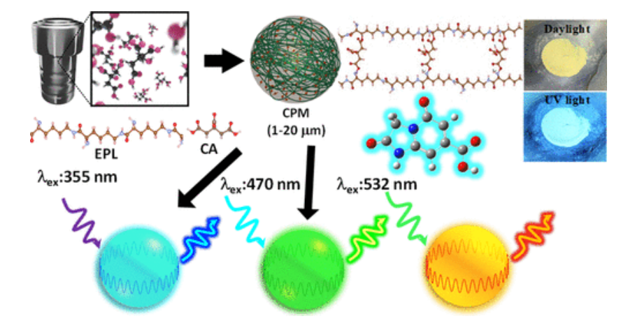 圖 1. 通過 CA 和肽結構之間的水熱反應以及激發波長依賴性顏色可變光子微諧振器結構合成 CPM 的示意圖。插圖顯示了 CPM 在日光和紫外線下的數碼照片。