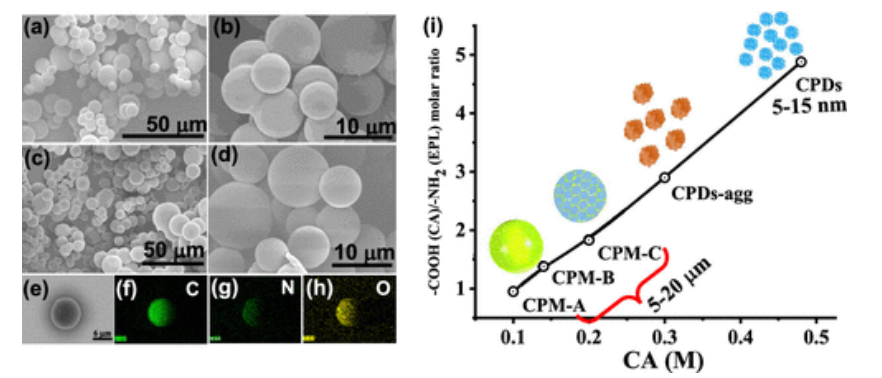 圖 2. (a–d) CPM 的 SEM 圖像(注釋為 CPM-A 和 CPM-B)。 (e–h) 單個 CPM-A 的 SEM-EDS 元素圖。 (i) 通過控制交聯來調整顆粒形態,將 CPM 形成 CPD 結構的合成策略。