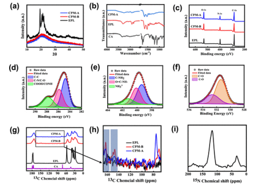 圖 3. (a–c) EPL 和 CPM 的 XRD、FTIR 和 XPS 光譜。 CPM-A 的 (d) C-1s、(e) N-1s 和 (f) O-1s 的解卷積 XPS 譜。 (g–i)與起始材料CA和EPL相比的固態13C CPMAS NMR譜,以及CPM-A的15N CPMAS實驗譜。