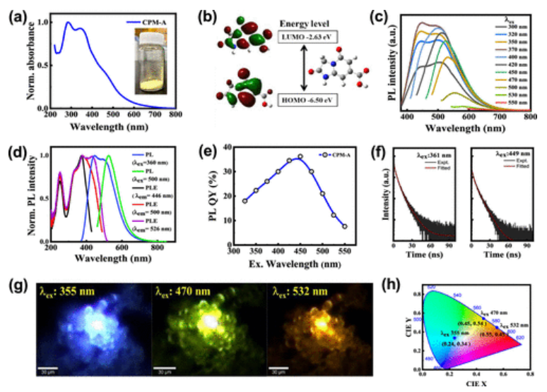 圖 4.(a) CPM-A 的紫外-可見光譜(插圖為照片)。 (b) 優化后的 IPCA 衍生分子和前沿軌道能量圖的高斯計算結果。 (c) 不同激發波長下CPM-A的PL光譜。 (d) CPM-A 的歸一化激發發射光譜。 (e) 不同激發波長下的 PLQY。 (f) CPM-A 在 361 和 449 nm 激發下的 PL 衰減曲線,并分別在 449 和 532 nm 處監測。 (g) 用 355、470 和 532 nm 激光激發記錄的 CPM-A 多色發射的 μ-PL 圖像。 (h) CPM-A 多色發射的相應 CIE 坐標。