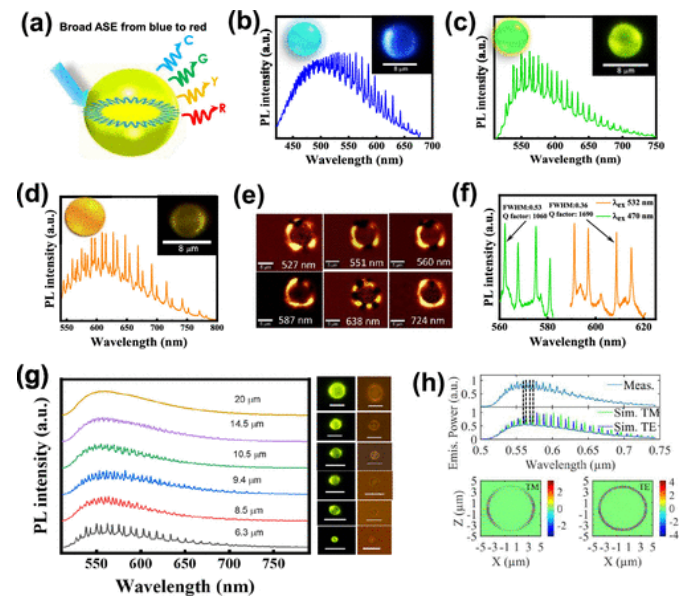 圖 5.(a) ASE 從藍色到紅色波長的示意圖。 (b-d) 通過在其邊緣進行 355、470 和 532 nm 激光激發,單個 CMP 發出藍-紅范圍內的 WGM 發射;插圖顯示了單個 CPM 的相應 PL 圖像和光限制示意圖。 (e) 單個微球的 μ-PL 映射圖像和相應的邊緣光限制。 (f) 通過不同激發激光源的 CPM 的 Q 因子。 (g) 不同直徑 CPM 的 ASE 行為以及通過 470 nm 激光邊緣激發(比例尺 20 μm)獲得的相應 PL 圖像。 (h) 在 470 nm 處激發的實驗(上)和模擬(中)PL 光譜以及在單個微球的 TM 和 TE 共振下激發的電場分布(下)。