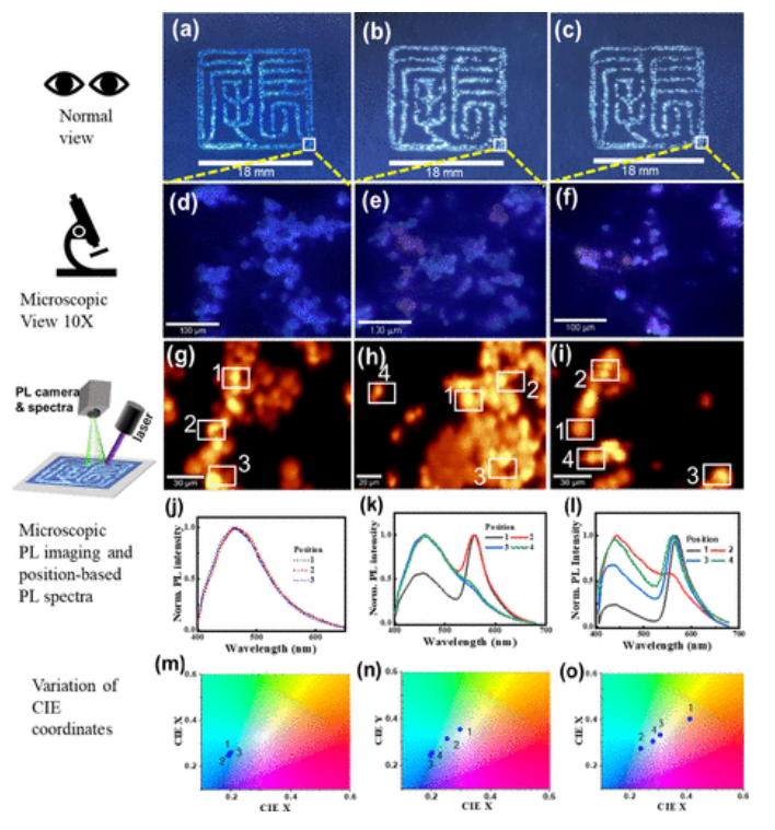 圖 7. 使用 (a) CPM-A 和 (b) 和 (c) CPM-A+CPM@Rh6G2 墨水混合物在紫外光下在白紙上印制印章的熒光照片。 (d-f) 相應熒光印章的白色標記區域的放大共焦熒光顯微鏡圖像。使用 (g) CPM-A 和 (h) 和 (i) CPM-A+CPM@Rh6G2 墨水制作的微區域絞印章的 μ-PL 映射圖像。 (j) 和 (m)、(k) 和 (n)、(l) 和 (o) μ-PL 光譜在不同位置(白色方塊)的相應 CIE 坐標處從 (分別為g)、(h)和(i)。