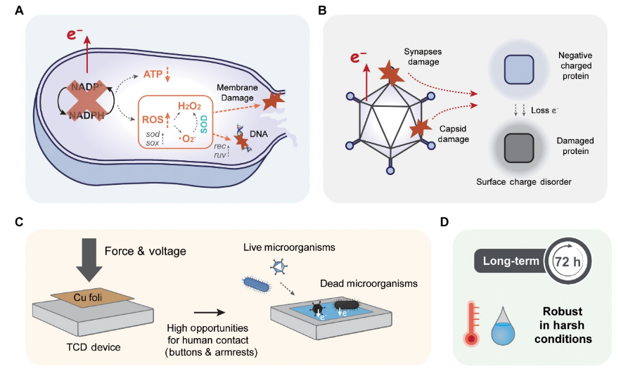 (A 和 B) 基于電子轉移的 TCD 過程中涉及的細菌 (A) 和病毒 (B) 滅活機制的示意圖。 (C) TCD 設備在室內環境中高接觸表面(例如電梯按鈕和醫院扶手)的潛在應用場景。 (D) TCD 裝置在實際應用中用于微生物滅活的獨特性能(可靠性和穩健性)。
