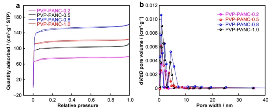 2吸附-脫附等溫線;b PVP-PANC-x的孔徑分布。