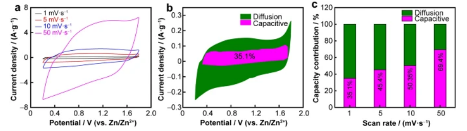 -1時的擴散控制和電容電荷貢獻;c PVP-PANC-0.8//Zn ZHS 在掃描速率為1至50 mV s
