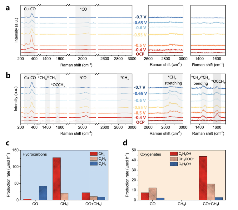 Fig 4. 機理研究。在 OCP 和不同電位下,(a) 裸銅和 (b) 層狀銅/銀串聯(lián)催化劑的原位拉曼光譜,每種催化劑都有兩個特定的放大視圖,范圍分別為 2600 至 3000 cm