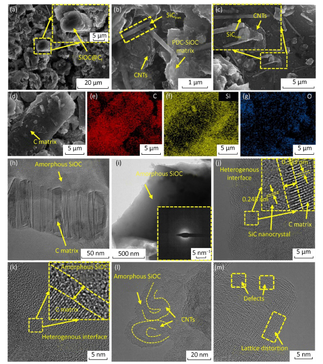 圖 3. SCC-CS 復合材料的表面形貌(a–c)。SCC-CS 復合材料的高倍放大圖像(d)以及相應的 C、Si 和 O 元素分布(e–g)。SCC-CS 復合材料的 TEM 圖像(h–m)。插圖為相應的 SAED 圖像和放大圖。