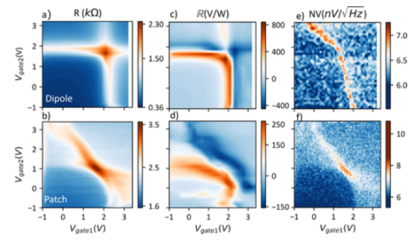 圖3. 偶極天線(a, c, e)和貼片(b, d, f) PTE探測器在室溫下的輸運特性。(a, b)兩個頂柵極上電壓的函數圖,顯示了四個不同的區域,對應于不同的摻雜結構:p-n, p-p, n-p和n-n。(c, d)在沒有太赫茲激勵的情況下,對柵極電壓的直流輸運響應度,以伏特/瓦(V/W)表示。(e, f)在不存在太赫茲激勵的情況下,噪聲電壓與柵極電壓的關系圖。