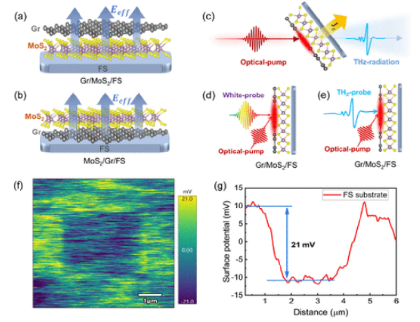 圖1. Gr-MoS2異質結構示意圖及實驗方法。(a-b)在熔融二氧化硅(FS)襯底上生長的垂直堆疊的Gr/MoS2和MoS2/Gr異質結構示意圖,藍色箭頭表示襯底引入的有效電場。(c-e) TES、TAS和TRTS的光譜圖。(f)和(g)分別為KPFM測量得到的FS基板顏色圖和電位圖。