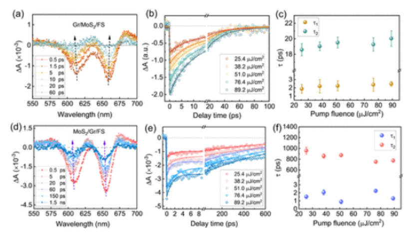 圖4. Gr-MoS2異質結構在1.9 eV (650 nm)激發下的TAS。(a,d) Gr/MoS2和MoS2/Gr異質結構的代表性TAS分別在不同延遲時間下探測,泵浦流量設置為76.4 μJ cm-2。(b,e)幾種泵浦作用下Gr/MoS2和MoS2/Gr的a -激子態衰減動態,其中實線為雙指數衰減函數的擬合曲線。(c, f) a -激子態在Gr/MoS2和MoS2/Gr異質結構中的擬合壽命。
