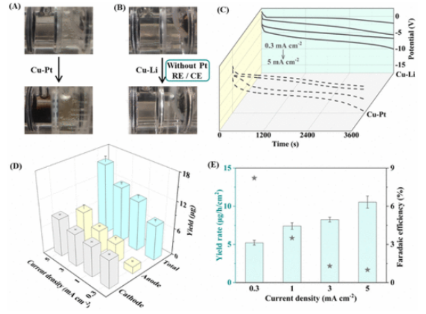圖2. (A) 銅-鉑和 (B) 銅-鋰的初始狀態和終端狀態照片。(C) 不同電流密度下的電壓-時間曲線;(D) 陰極、陽極和總氨產量(帶誤差條);(E) Cu-Li 的氨產量和法拉第效率(帶誤差條)。