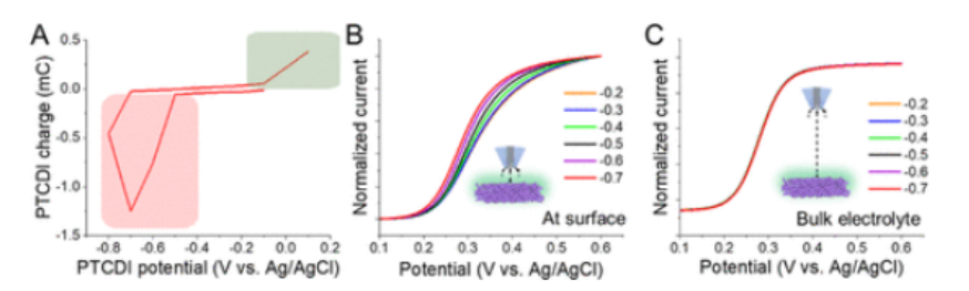 4-) 氧化的歸一化 LSV。(C) PtUME 與 PTCDI 間距為 1000 μm 時還原過程中收集的 LSV。