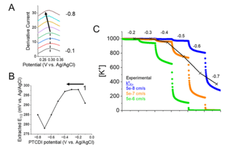 + 的脫出/插入。(A) PTCDI 電極在電位階躍循環過程中的綜合響應。(B) PTCDI 還原過程中 ([Fe(CN)