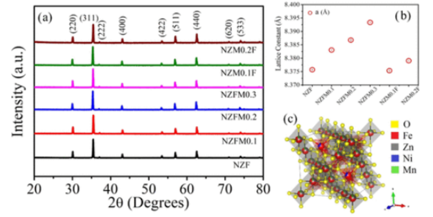 圖2. (a)室溫下所有研究樣品的具有識別平面的 X 射線衍射圖,(b)樣品晶格常數(shù)的變化,以及(c)來自 VESTA 的 NZFM0.3的晶體結(jié)構(gòu)表示。