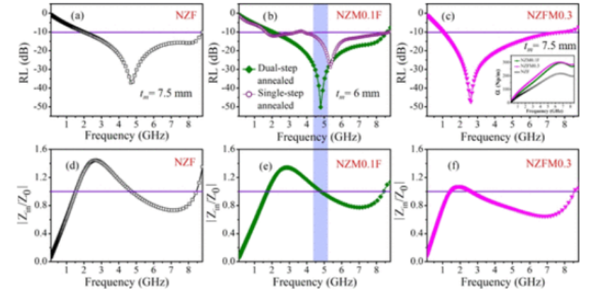 圖7. 對于(a)NZF、(b)NZM0.1F和單步退火固體NZM0.1F,以及(c)NZFM0.3樣品,RL與f在各自tm值下繪制,以進(jìn)行比較。(d)NZF、(e)NZM0.1F和(f)NZFM0.3[插入(c)]這三個樣品的頻率相關(guān)衰減常數(shù)(α)曲線對應(yīng)的| Zin/Z0 |比率與頻率圖。