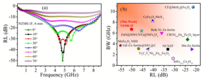 圖8. (a) 不同電磁波入射角下RL的頻散曲線。(b) NZM0.1F與CuFe2O4/MoS2鐵氧體微波吸收劑的最佳反射損耗(RLmax)和帶寬(BW)的比較圖CF@MoS2@Fe3O4,大塊Ni–Zn鐵氧體, ZnO@MWCNTs@NiFe2O4, CB/Ni0.6Zn0.4Fe2O4層, MnFe2O4 NHS, Gd–Coferrite@SiO2@C、 NF/NZF、Mn–Zn鐵氧體、Ti3C2Tx/Ni0.5Zn0.5Fe2O4、和SrFe12–xCoxO19