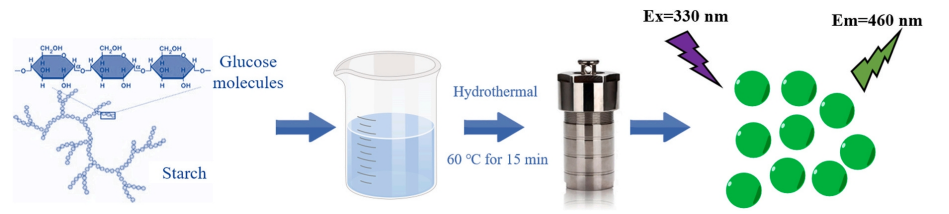 流程圖1. 采用水熱法由玉米淀粉制備石墨烯量子點(GQDs)的示意圖。