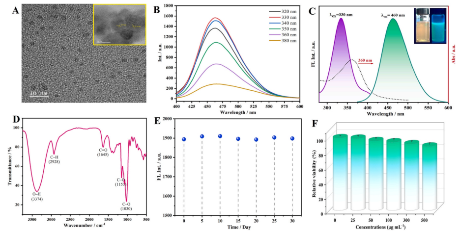 圖1. (A)高分辨率透射電子顯微鏡觀察,(B)不同激發波長下的熒光光譜,(C)紫外可見吸收和熒光激發發射光譜,(D)傅里葉透射紅外光譜,(E)合成淀粉衍生石墨烯量子點(GQDs)的熒光穩定性和細胞毒性評估。