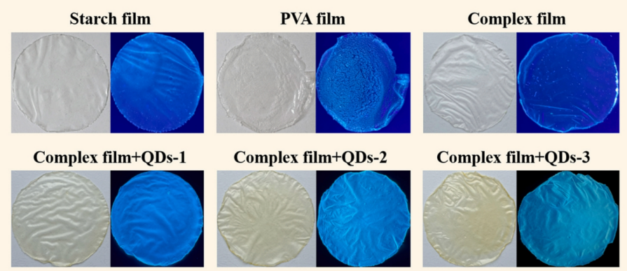 文章報道了一種簡單、綠色的制備石墨烯量子點(GQDs)的方法,即利用玉米淀粉作為納米填料制備淀粉基活性薄膜。GQDs水溶液具有不受激發波長影響的發光特性、穩定的光致發光特性和良好的生物安全性。結果表明,淀粉基GQDs與天然高分子淀粉/聚乙烯醇(PVA)基質具有良好的相容性。當GQDs的添加量大于50 μg/mL時,復合薄膜具有良好的UV阻隔性能。此外,100 μg/mL的GQDs顯著提高了薄膜的斷裂伸長率和拉伸強度,分別提升了1.79倍和2.94倍,而水溶性僅為淀粉/ PVA薄膜的53.9%。含有150 μg/mL GQDs的淀粉/PVA薄膜對2,2-二苯基-1-苦酰肼自由基的最大清除率為83.3%。隨著GQDs添加量的增加,復合薄膜對金黃色葡萄球菌和大腸桿菌的抑制作用越來越顯著。淀粉源復合薄膜的環保性和優越的性能使其有望成為傳統塑料材料的活性包裝的替代品。
