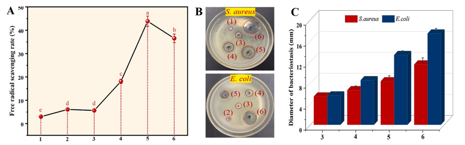 圖4. 薄膜的(A) 抗氧化活性,(B) 對金黃色葡萄球菌和大腸桿菌的抑制區圖片,以及 (C) 抗菌效率