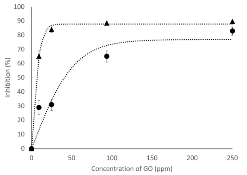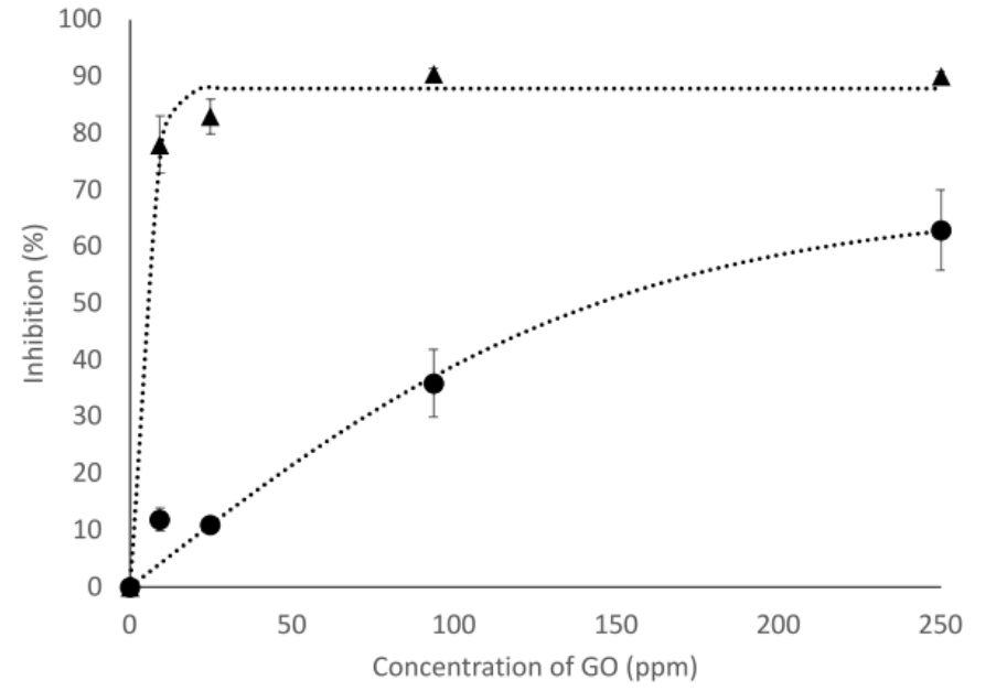 圖3. 在膽鹽(NaTC)存在(圓圈)或不存在(三角形)的情況下,不同濃度氧化石墨烯在2小時時對脂肪酶的抑制百分比。虛線只是為了說明趨勢。誤差條表示標準差。