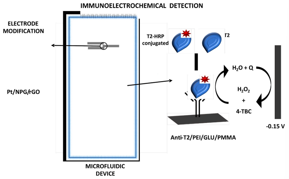 T-2是最有影響力的細胞毒性食源性真菌毒素之一。在這項工作中,我們開發了一種用于小麥胚芽樣品中T-2毒素定量的電化學微流控免疫傳感器并對其進行了表征。T-2毒素檢測采用基于單克隆抗T-2抗體固定在聚甲基丙烯酸甲酯(PMMA)微流控中心通道的競爭性免疫分析法。通道末端的鉑絲工作電極通過還原氧化石墨烯(rGO)-納米孔金(NPG)的單步電沉積工藝進行原位修飾。讓樣品中的T-2毒素與T-2-辣根過氧化物酶(HRP)偶聯物競爭固定抗T-2單克隆抗體的特異性識別位點。在過氧化氫(H