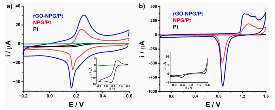 圖3. a)Pt(黑線)、NPG/Pt(紅線)和rGO-NPG/Pt(藍線)在0.1 mol L