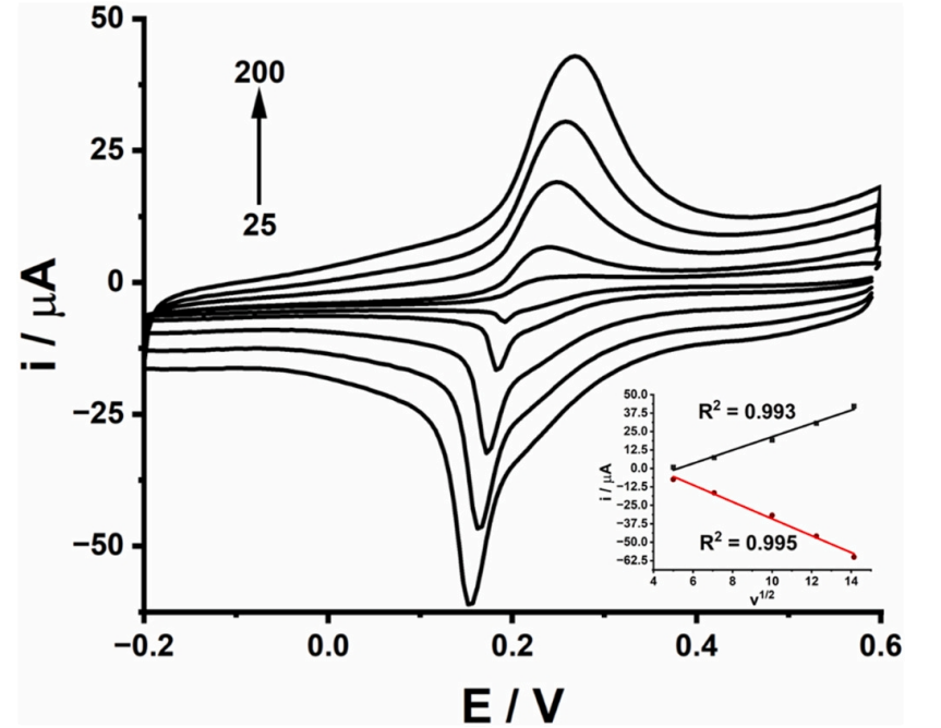 -1下記錄的CVs曲線。插圖:氧化還原峰值電流值與掃描速率平方根(