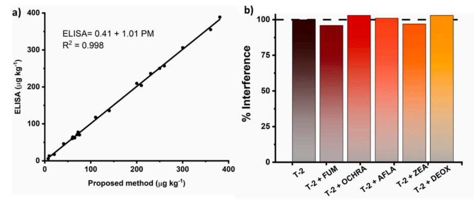 圖5. a)電化學免疫傳感器與ELISA對不同T-2濃度的相關性圖;b)幾種真菌毒素存在時的干擾研究。