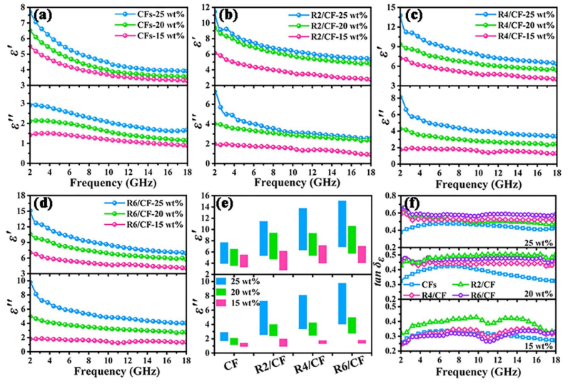 Fig 3. CFs, R2/CF, R4/CF和R6/CF的(a-e)介電參數以及對比圖,(f)介質損耗正切值。