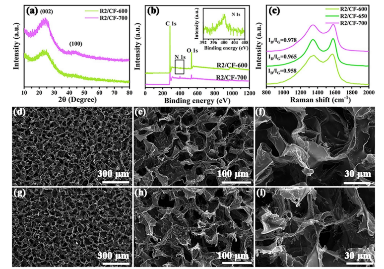 Fig 5. R2/CF-600, R2/CF和 R2/CF-700(a)XRD, (b)XPS,(c)Raman spectra, SEM圖像(d-f)R2/CF-600和(g-i)R2/CF-700。