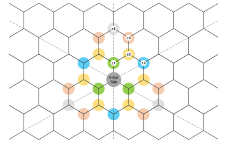 圖1. 氧化官能團在氧化石墨烯上的不同分布位點。中間的灰色圓盤表示與原始氧化官能團結合的初始位點,其他不同距離和相對位置的位點用不同顏色和數字標記的圓盤來區分。