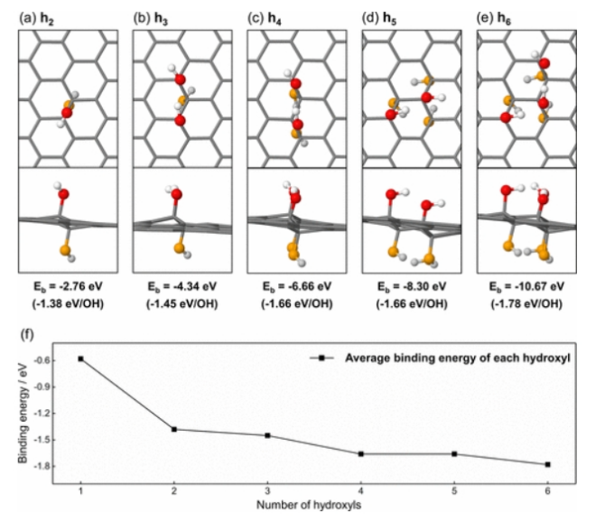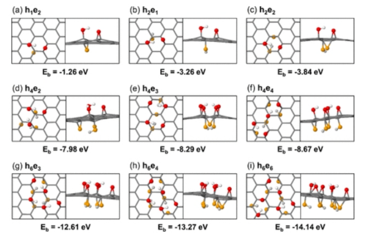6最穩定結構中每個羥基的平均結合能。紅色球代表氧化石墨烯平面上方的氧原子,白色球代表氧化石墨烯平面上方的氫原子,橙色球代表氧化石墨烯平面下方的氧原子,淺灰色球代表氧化石墨烯平面下方的氫原子。