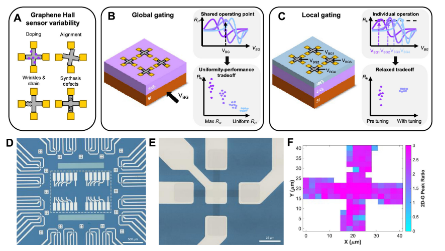 石墨烯霍爾效應(yīng)磁場(chǎng)傳感器(GHSs)具有與最先進(jìn)的III-V半導(dǎo)體制成的商用霍爾傳感器相當(dāng)?shù)母咝阅堋J┮策m用于CMOS兼容的制造工藝,使GHSs成為生物傳感和掃描探針應(yīng)用中成像領(lǐng)域的磁性傳感器陣列的有吸引力的候選者。然而,它們的實(shí)際吸引力受到響應(yīng)異質(zhì)性和漂移的限制,這是由二維(2D)材料對(duì)局部器件缺陷的高靈敏度引起的。為了解決這一挑戰(zhàn),本研究設(shè)計(jì)了一個(gè)GHS陣列,其中每個(gè)GHS都添加了一個(gè)單獨(dú)的后門,允許每個(gè)傳感器的載波密度獨(dú)立于陣列中的其他傳感器進(jìn)行靜電調(diào)諧。與使用相同后門對(duì)所有設(shè)備進(jìn)行調(diào)優(yōu)時(shí)遇到的限制相比,我們期望單個(gè)調(diào)優(yōu)所提供的靈活性將允許陣列的靈敏度、均勻性和可重構(gòu)性得到增強(qiáng)。本研究制作了16個(gè)GHS陣列,每個(gè)都有自己的后門終端,并表征了在CMOS兼容電壓范圍內(nèi)調(diào)制GHS載流子密度和霍爾靈敏度的能力。然后,本研究證明了單個(gè)設(shè)備調(diào)諧可以用來(lái)打破GHS陣列中設(shè)備靈敏度和均勻性之間的權(quán)衡,從而增強(qiáng)這兩個(gè)目標(biāo)。研究結(jié)果表明,在單后門操作下,GHS陣列表現(xiàn)出>30%的可變性,可以通過(guò)單獨(dú)調(diào)優(yōu)來(lái)補(bǔ)償,使其在對(duì)陣列靈敏度影響最小的情況下達(dá)到<2%的可變性。