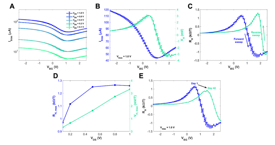 圖2. GHS性能和調(diào)優(yōu)特性。(A)偏置電壓變化時(shí),偏置電流與后門電壓的關(guān)系。(B)同時(shí)測(cè)量偏置電流(藍(lán)色)和霍爾電壓(綠色),以增加后門電壓。(C)增加(藍(lán)色)和減少(綠色)后門電壓時(shí)測(cè)量的霍爾系數(shù)RH。(D)變化偏置電壓下可達(dá)到的最大霍爾系數(shù)(藍(lán)色)和霍爾電壓(綠色)。(E)初始霍爾系數(shù)調(diào)諧曲線與環(huán)境條件下42天后測(cè)量的霍爾系數(shù)調(diào)諧曲線的比較。在室溫環(huán)境條件下,同一傳感器的所有測(cè)量值。誤差條表示兩次重復(fù)掃描的標(biāo)準(zhǔn)誤差。
