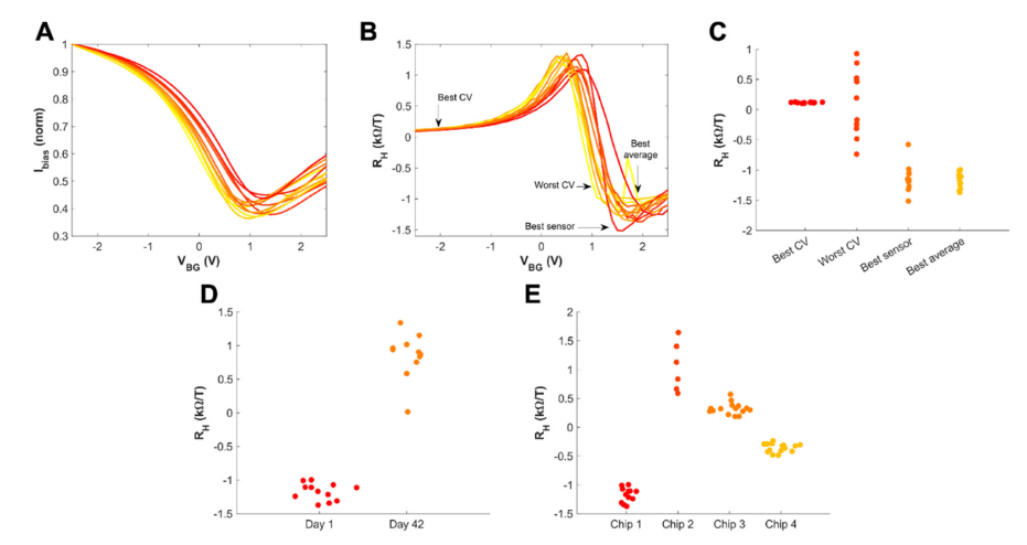 圖3. GHS性能的變化。(A) N = 12個(gè)傳感器的偏置電流調(diào)諧曲線疊加在單個(gè)芯片上(排除4個(gè)無(wú)響應(yīng)傳感器)。每條曲線歸一化到它的最大值。(B) 12個(gè)傳感器霍爾系數(shù)調(diào)諧曲線在單個(gè)芯片上的疊加。(C)圖3B中的霍爾系數(shù)在對(duì)應(yīng)于“最佳CV”(最低變異系數(shù))、“最差CV”(最高變異系數(shù))、“最佳傳感器”(組中表現(xiàn)最佳的傳感器的最大值)和“最佳平均值”(最大平均霍爾系數(shù))的VBG值處繪制。(D, E)使用“最佳平均”條件。(D)制造后和在環(huán)境條件下42天后測(cè)量的霍爾系數(shù)分布的比較。(E) 4個(gè)獨(dú)立芯片上霍爾系數(shù)分布的比較。