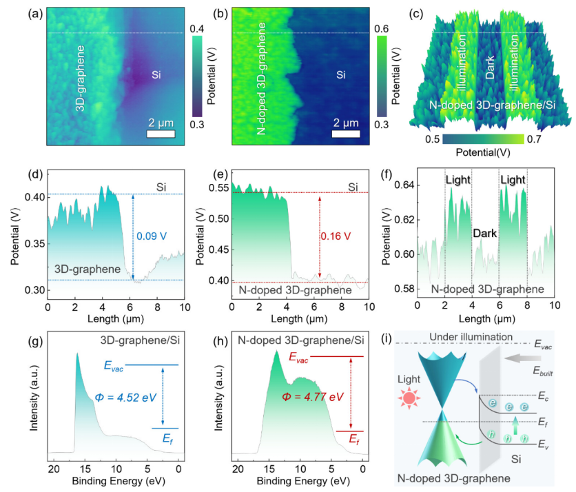 (c) N摻雜3D -石墨烯/硅異質結從暗到亮再回到暗的表面電位變化。(d)、(e)和(f)圖分別表示3D -石墨烯/硅異質結(圖a)、N摻雜3D -石墨烯/硅異質結(圖b)和過渡表面電位變化(圖c)中沿特定線的測量表面電位分布。(g) 3D -石墨烯/Si和(h) N摻雜3D -石墨烯/Si的UPS光譜。(i)光照射下N摻雜3D -石墨烯/硅異質結體系平衡后的能帶圖。