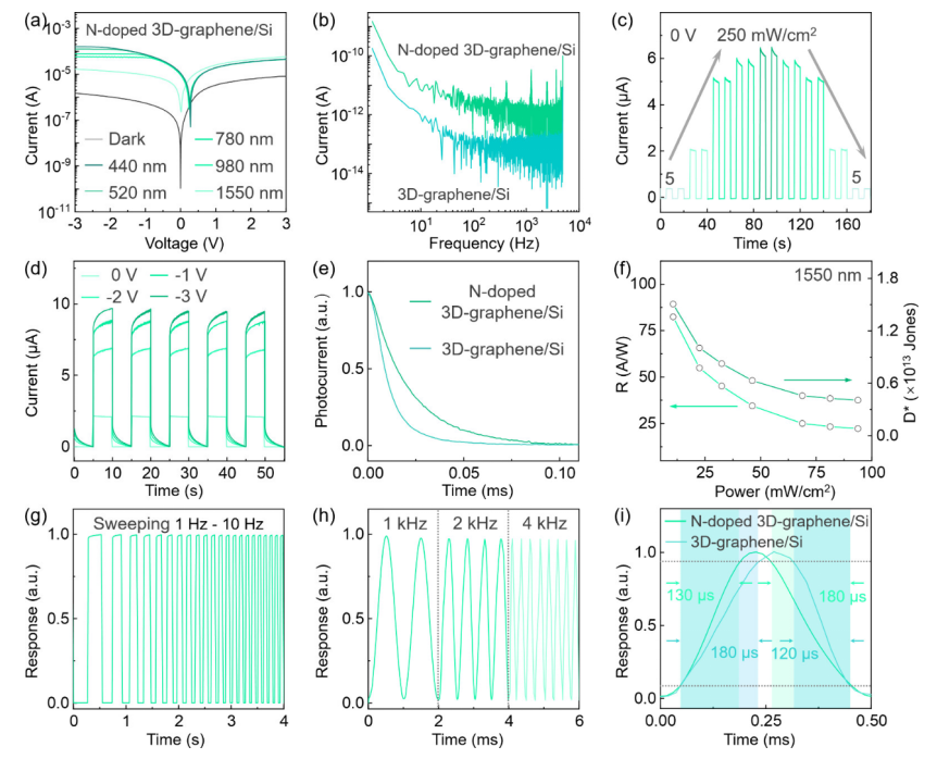 圖4. (a)不同波長光照下N摻雜3D -石墨烯/硅異質結光電探測器的I-V曲線。(b)兩個光電探測器之間噪聲電流的比較。(c)基于N摻雜3D -石墨烯/硅異質結的光電探測器在變強1550nm光照射下的光響應,偏置為0 V。(d)光電探測器在1550 nm光照射下,分別在偏置0、−1、−2和−3 V下的時間光響應。(e)兩個光電探測器的瞬態光電流衰減曲線。(f) N摻雜3D -石墨烯/硅異質結光電探測器的響應率和比探測率。(g)線性掃描時間分辨光響應。(h) N摻雜3D -石墨烯/硅異質結光電探測器在不同頻率下的光響應。(i)在2kHz記錄的部分光響應曲線的放大圖像,說明兩個光電探測器的快速上升和衰減時間。