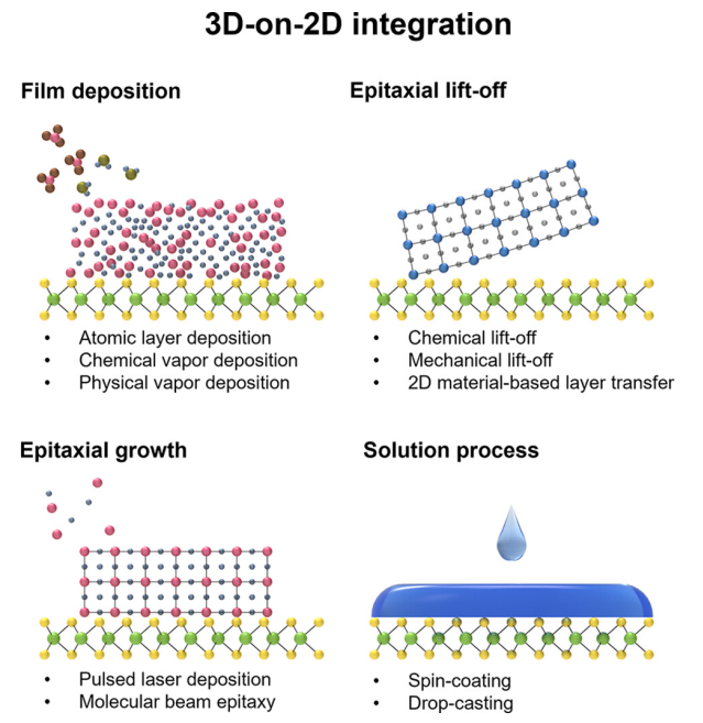 二維(2D)材料由于具有超高載流子遷移率、優越的機械柔性和特殊的光學特性等下一代電子學所需的特殊性能而受到廣泛關注。盡管其潛力巨大,但實驗室到晶圓廠過渡的主要技術難點之一在于二維材料與經典材料系統(通常由三維(3D)材料組成)的無縫集成。由于二維表面的自鈍化性質,在二維材料上形成三維材料異質結構(3D-on-2D)時,獲得定義良好的界面尤其具有挑戰性。在這里,本研究全面回顧了3D-on-2D摻入策略的最新進展,包括直接生長到基于層轉移的方法以及從非外延到外延的集成方法。技術進步和障礙進行了嚴格的討論,以探索最佳的,但可行的,整合策略的三維對二維異質結構。最后,展望了混合維集成過程,確定了最新技術中的關鍵挑戰,并提出了未來創新的潛在機遇。