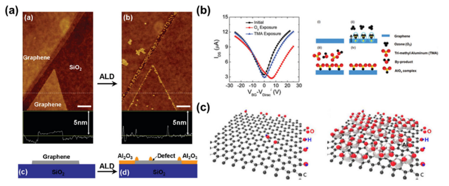 圖2. 二維材料上電介質層的原子層沉積。(a) 原始石墨烯的Al