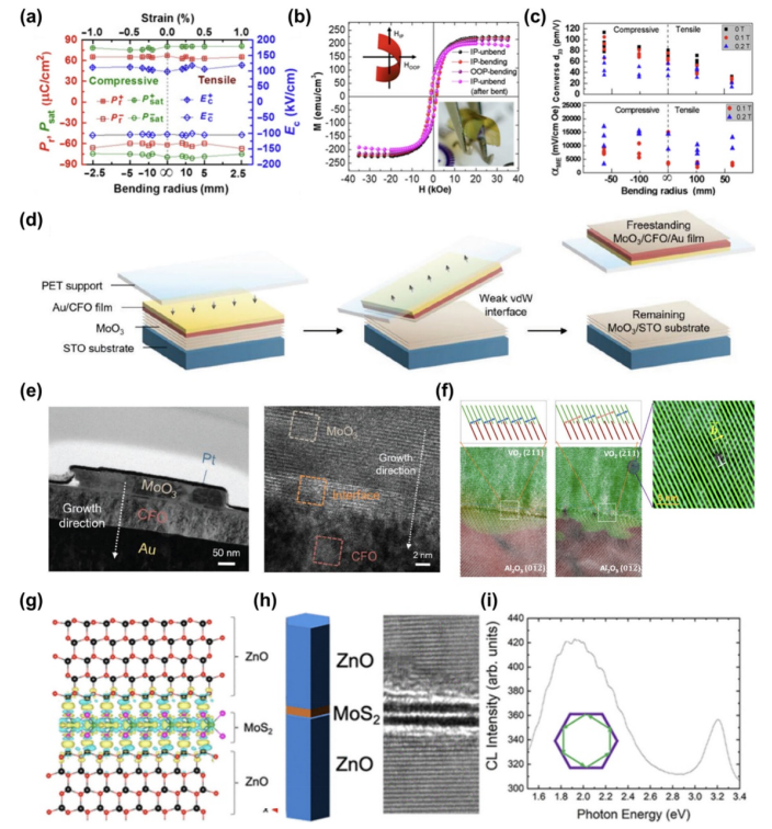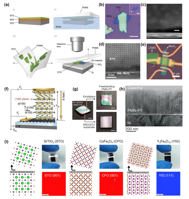 3/石墨烯垂直裝置示意圖。(g)SRO/STO襯底上生長的PMN-PT薄膜(左)、剝落的獨立PMN-PT膜(右上)和PMN-PT膜剝落后剩余的SRO/STO襯底的照片(右下)。比例尺,2 mm.(h)使用Ti(30 nm)/Ni(3μm)金屬應力源層的剝落PMN-PT膜的橫截面透射電子顯微鏡(TEM)圖像。(i) 2ML石墨烯輔助外延層轉移:剝離100 nm厚STO(左)、CFO(中)和YIG(右)膜的示意圖(左)、照片(右上)和電子背散射衍射圖(右下)。