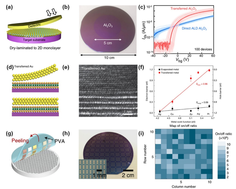 2頂部轉移的Au電極的橫截面示意圖和TEM圖像,具有原子銳利和干凈的金屬-半導體界面。(f) 不同金屬功函數的金屬-半導體結的肖特基勢壘高度。(g) 石墨烯輔助金屬轉移印花工藝示意圖。(h) 金圖案轉移到4英寸SiO