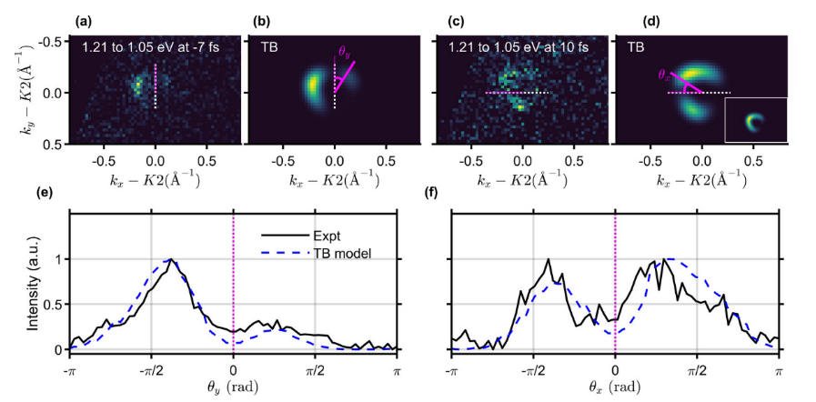 圖4. 與緊束縛(TB)理論的比較。(a,c)K2分別為y和x極化激發(fā)時(shí),Dirac點(diǎn)上方1.05至1.21 eV的電子Δt=0的動(dòng)量分布譜。(b,d)由TB模型預(yù)測(cè)的光電子動(dòng)量圖。(d)中的插圖是沒有泵矩陣元素,說(shuō)明了所謂的“暗走廊”以及在沒有贗自旋極化的情況下信號(hào)的外觀。TB模型與(e)y極化和(f)x極化實(shí)驗(yàn)的角分辨強(qiáng)度比較。泵極化方向由頂部面板中的白色虛線指示。指定的泵節(jié)點(diǎn)由頂部面板中的細(xì)品紅線和底部面板中的品紅虛線表示。