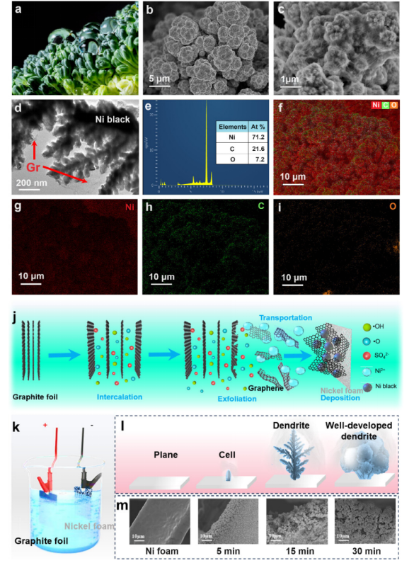 圖2. 光熱轉換膜的微觀形態和元素分布:(a)花椰菜。(b) Ni膜的SEM圖像。(c) SEM圖像Ni@Gr膜。(d) TEM圖像Ni@Gr膜。(e至i)C、O和Ni的EDSNi@Gr膜表面。(j)示意圖Ni@Gr一步電化學法制備光熱轉換膜。(k) 電化學裝置。(l) 形態形成示意圖。(m) 掃描電鏡圖像Ni@Gr膜在不同的電化學制備時間下。