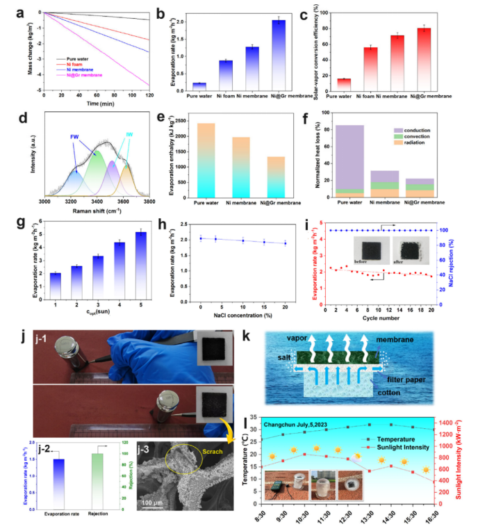 圖5. 界面蒸發性能Ni@Gr光熱轉換膜:(a)不同光熱轉換膜(1個太陽)的太陽能驅動界面蒸發器的失重曲線。(b) 膜的蒸發速率(1個太陽)。(c) 太陽能-膜的蒸汽轉換效率(1個太陽)。(d) 水分子的拉曼光譜Ni@Gr膜。(e) (f)蒸發過程的歸一化熱損失。(g) 輻照強度對輻射強度的影響Ni@Gr蒸發率。(h) 蒸發速率Ni@Gr膜在不同NaCl濃度下。(i) 海水淡化性能Ni@Gr膜。(j) 摩擦磨損試驗Ni@Gr膜。(k) 界面蒸發過程中的毛細效應。(l) 室外試驗過程中太陽光輻照強度和環境溫度的變化。
