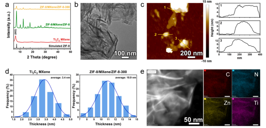 Fig 1. (a) Ti3C2 MXene、ZIF-8/MXene/ZIF-8、ZIF-8/MXene/ZIF-800 和模擬 ZIF-8 的 PXRD 圖樣。(b) ZIF-8/MXene/ZIF-8-300 的 TEM 圖像。(c) ZIF-8/MXene/ZIF-8-300 的原子力顯微鏡圖像和相應的高度剖面。(d) 基于 ZIF-8/MXene/ZIF-8-300 的 TEM 結果的核心 Ti3C2 MXene 和整個 ZIF-8/MXene/ZIF-8-300 厚度的統計分布。(e) ZIF-8/MXene/ZIF- 8-300 的暗場 STEM 和相應的元素圖譜圖像。
