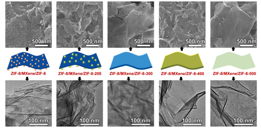 Fig 2. ZIF-8/MXene/ZIF-8 和隨溫度變化的 ZIF-8/MXene/ZIF-8-X 的 SEM(上)和 TEM(下)圖像。