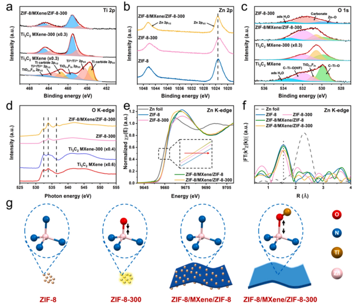 Fig 3. (a) Ti3C2 MXene、Ti3C2 MXene-300 和 ZIF-8/MXene/ZIF-8-300 的鈦 2p 高分辨率 XPS 光譜。(b) ZIF-8、ZIF-8-300 和 ZIF-8/MXene/ZIF-8-300 的 Zn 2p 高分辨率 XPS 光譜。(c) Ti3C2 MXene、Ti3C2 MXene-300、ZIF-8-300 和 ZIF-8/MXene/ZIF-8-300 的 O 1s 高分辨率 XPS 光譜。(d) Ti3C2 MXene、Ti3C2 MXene-300、ZIF-8-300 和 ZIF-8/MXene/ZIF-8-300 的 O Kedge XAS 光譜。(e-f)Zn 箔、ZIF-8、ZIF-8-300、ZIF-8/MXene/ZIF-8 和 ZIF-8/MXene/ZIF-8 的 Zn K 邊 XANES(e)和 EXAFS 傅立葉變換光譜(f)。(g) ZIF-8、ZIF-8-300、ZIF-8/MXene/ZIF-8 和 ZIF-8/ MXene/ZIF-8-300 的優化局部結構。