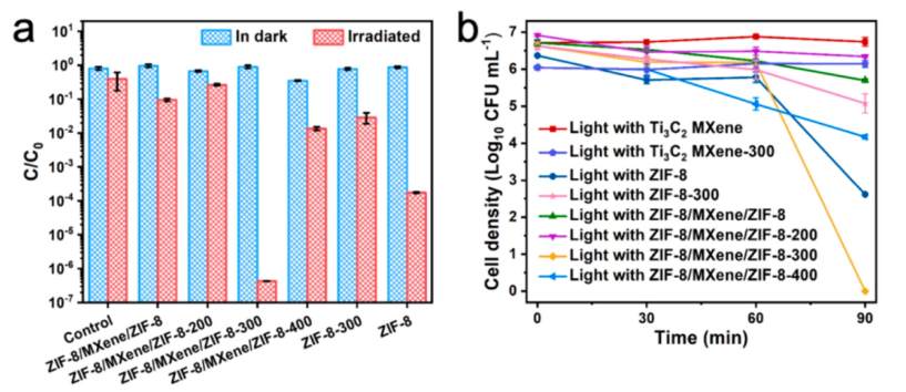 開發有效的水凈化系統對于控制和修復環境污染至關重要,尤其是在殺菌方面。在此,作者展示了精心設計的由二維(2D)Ti3C2 MXene 納米片核心和連續 ZIF-8 超薄外層組成的三明治結構復合納米片及其在光催化殺菌中的潛在應用。研究結果表明,保形 ZIF-8-MXene 納米片擴大了光吸收范圍(826 nm),提高了光熱轉換效率(6.2 ℃ s